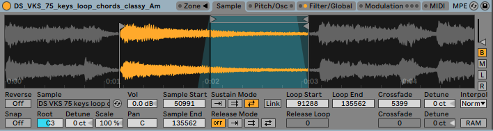 (Using Ableton’s loop and cross-fade options, we can play the sample but loop the end giving you access to an amazing, never-ending evolving pad)